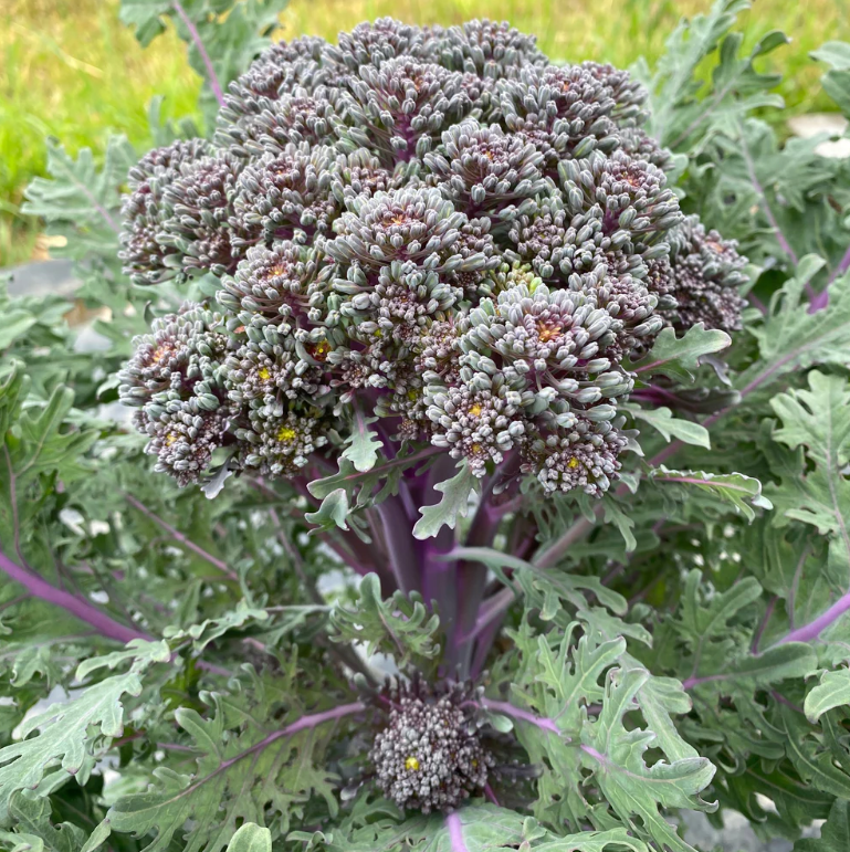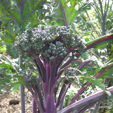 Bred by Frank Morton, Purple Peacock comes from crosses between ‘Green Goliath’ broccoli and two kales. Green buds, toothy pink-veined leaves, and sweet purple stems make the large plants a beautiful garden addition. Young leaves are salad ready and mature leaves can be eaten like kale. Long floret stems erupt first as loose heads of broccoli, followed by side shoots. Part of the Open Source Seed Initiative.